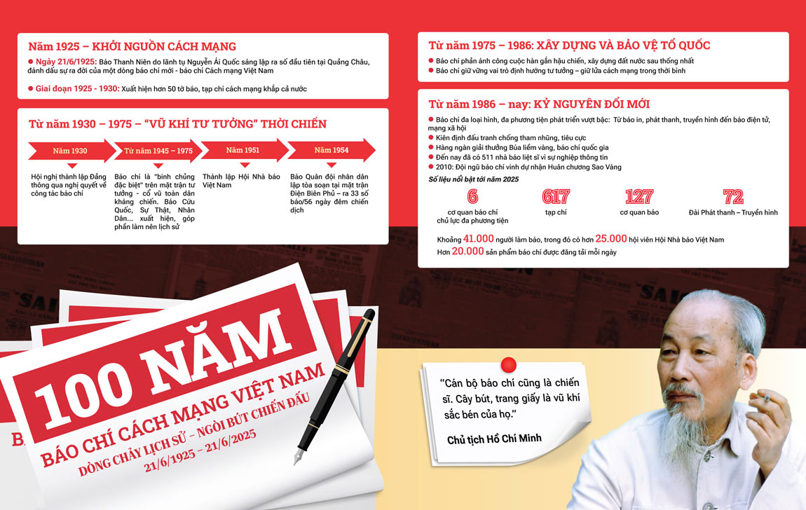 (TSVN) – Tròn 100 năm kể từ ngày Báo Thanh Niên ra số đầu tiên (21/6/1925), báo chí cách mạng Việt Nam đã đồng hành cùng dân tộc qua mọi chặng đường lịch sử. Từ vũ khí tư tưởng trong chiến tranh đến ngòi bút xây dựng và bảo vệ Tổ quốc thời bình, báo chí luôn giữ vai trò tiên phong. Bước vào kỷ nguyên số, đội ngũ người làm báo tiếp tục khẳng định bản lĩnh, lan tỏa khát vọng phát triển đất nước.