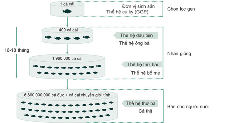 Hình 1. Số cá rô phi thương mại có thể đạt được từ cá mẹ sau nhiều bước chọn lọc trước khi bán cho người nuôi