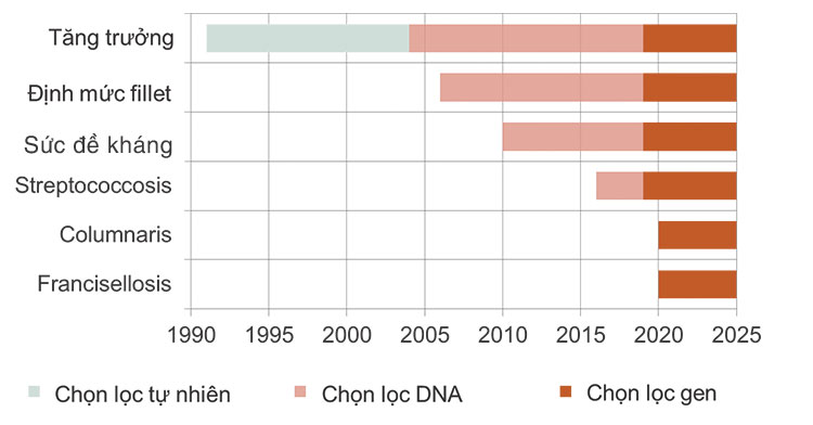 Những đặc tính như tỷ lệ fillet, kháng bệnh đặc trưng được đưa vào thế hệ 17 để đáp ứng nhu cầu ngành. Mục tiêu căn bản là cân bằng được sự chọn lọc hướng đến những tính trạng vượt trội như cá mạnh hơn, khả năng chịu đựng các yếu tố gây stress và thích nghi với sự thay đổi tốt hơn. Tính trạng tăng trưởng vẫn là quan trọng và thích hợp nhất, chiếm 40-50% trong chỉ số chọn lọc và tăng 7.1% qua mỗi thế hệ (Hình 3).