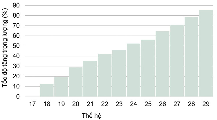Hình 3. Tăng trọng tương đối (%) của 12 thế hệ gần đây của đàn cá bố mẹ Genomar. Thế hệ 17 được sử dụng như đường cơ sở cho việc tính toán tăng trong trên thế hệ kế tiếp. Tăng trọng được tính khoảng 40 – 50% và những tính trạng khác chiếm 50 – 60% khi chọn lọc thế hệ tiếp theo.