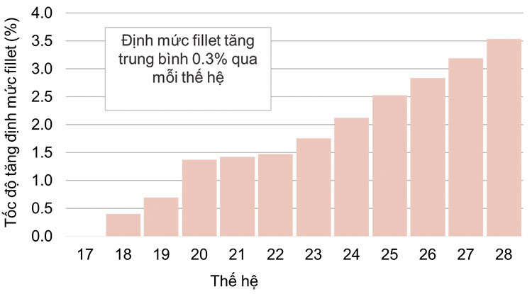 Xu hướng ngày càng phổ biến trên thị trường cá rô phi là việc chế biến thu hoạch cá rô phi fillet. Trong những thị trường như vậy, định mức fillet là tính trạng chính với ảnh hưởng lớn đến lợi nhuận của nhà máy chế biến và các công ty liên kết. Chúng tôi đã bắt đầu chọn lọc dựa trên định mức fillet trong thế hệ 17 và kể từ đó trở thành tiêu chí lâu dài cho chương trình sinh sản của chúng tôi (Hình 4). Thật không may, tiến trình cải thiện gen trong định mức fillet bị chậm lại bởi vì sự kế thừa chậm và thông tin về định mức fillet chỉ mang tính tương đối.