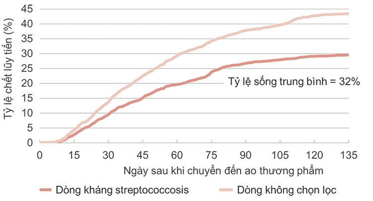 Vào 135 ngày sau khi vận chuyển ở giai đoạn nuôi, tỷ lệ chết lũy tiến trung bình 29,6% cho cá được chọn lọc và 43,4% cho cá không chọn lọc (Hình 5). Kết quả này tương đồng với kiểm chứng tại phòng thí nghiệm và chứng minh khả năng chọn lọc nhân tạo để cải thiện sức khỏe và tỷ lệ sống.