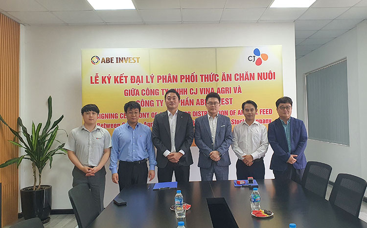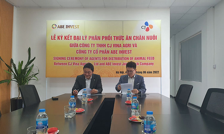 Ngày 23/6/2022, tại Hà Nội đã diễn ra lễ ký kết đại lý phân phối thức ăn chăn nuôi thương hiệu cám tôm Vamax giữa Công ty CP ABE Invest và Công ty TNHH CJ Vina Agri. Tham dự lễ ký kết có đại diện ban lãnh đạo cùng nhân viên khối văn phòng của hai công ty.