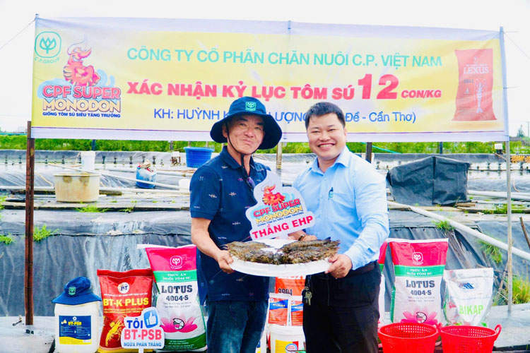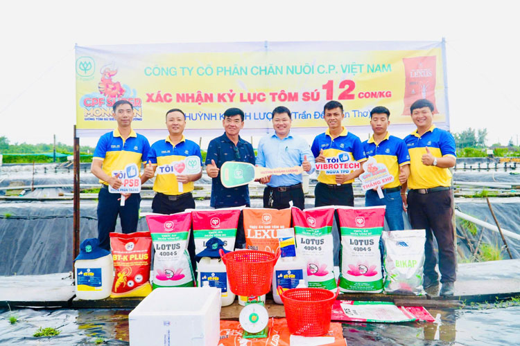 Nhân viên phụ trách địa bàn TP. Cần Thơ của C.P chính thức xác nhận kỷ lục tôm sú đạt kích cỡ 12 con/kg của anh Huỳnh Khánh Lượng