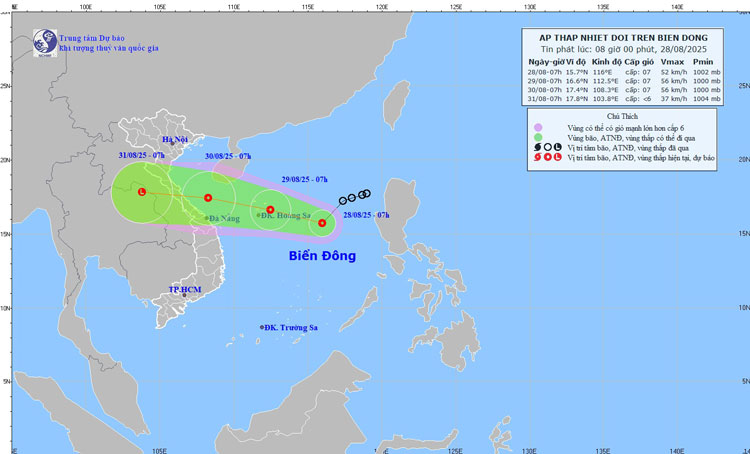 Theo Trung tâm Dự báo Khí tượng Thủy văn Quốc gia, hồi 7 giờ sáng nay (28/8), vị trí tâm áp thấp nhiệt đới ở khoảng 15,7 độ Vĩ Bắc và 116,0 độ Kinh Đông, trên vùng biển phía Đông khu vực Bắc Biển Đông. Sức gió mạnh nhất gần tâm đạt cấp 6-7 (39-61 km/h), giật cấp 9, di chuyển theo hướng Tây Nam với tốc độ khoảng 15 km/h.