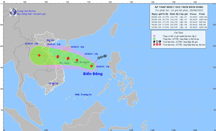 Theo Trung tâm Dự báo Khí tượng Thủy văn Quốc gia, hồi 13 giờ ngày 28/8, vị trí tâm áp thấp nhiệt đới ở khoảng 15,3 độ Vĩ Bắc và 115,7 độ Kinh Đông, trên khu vực Bắc Biển Đông, cách quần đảo Hoàng Sa khoảng 420km về phía Đông Đông Nam. Cường độ gió mạnh cấp 6-7, giật cấp 9, di chuyển theo hướng Tây Nam với tốc độ 10-15km/h.