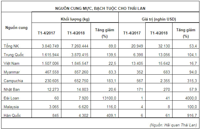 Theo số liệu thống kê của Hải quan Thái Lan, hiện NK dòng sản phẩm này của Thái Lan đang tăng. Cụ thể, NK mực, bạch tuộc của Thái Lan tăng liên tục trong 4 tháng đầu năm, có tháng tăng tới 172%. Tỉnh tổng 4 tháng đầu năm, Thái Lan đã NK gần 7,3 nghìn tấn mực bạch tuộc, trị giá 32 triệu USD, tăng 89% về khối lượng và 53% về giá trị.