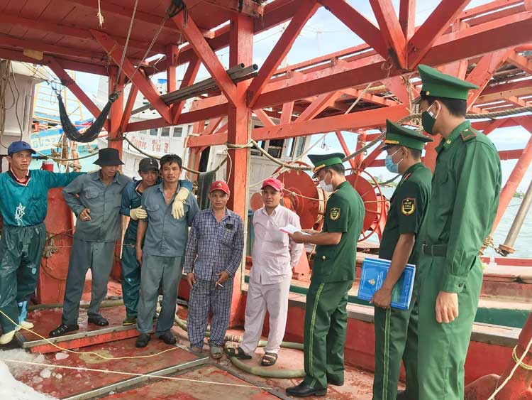 Cán bộ Trạm biên phòng cửa khẩu Cảng Vũng Tàu kiếm tra giấy tờ và thuyền viên trên tàu cá ở Cảng Cát Lở (TP.Vũng Tàu).
