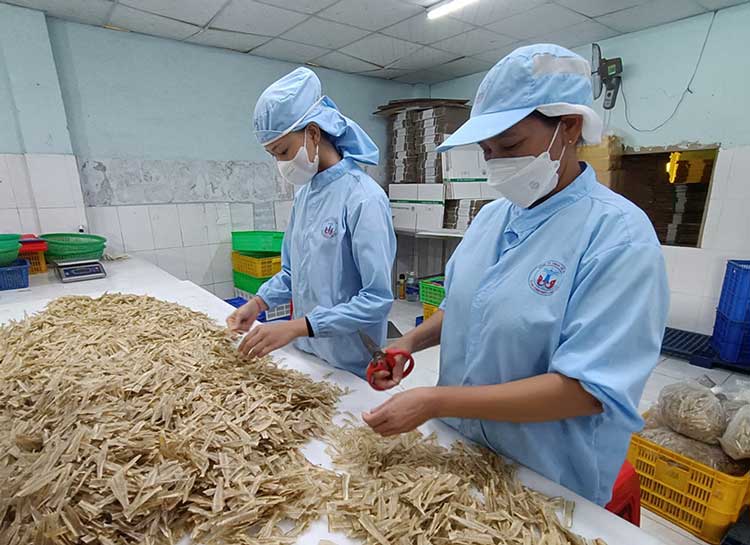 Công nhân Công ty Tứ Hải (TP.Vũng Tàu) sơ chế xương cá đục sấy khô xuất khẩu sang Nhật.