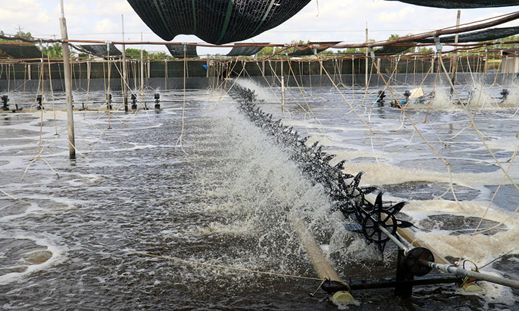 Đến cuối năm 2022, Bến Tre phát triển được gần 2.600 ha nuôi tôm ứng dụng công nghệ cao, năng suất bình quân từ 60 – 70 tấn/ha. Ảnh: TTXVN