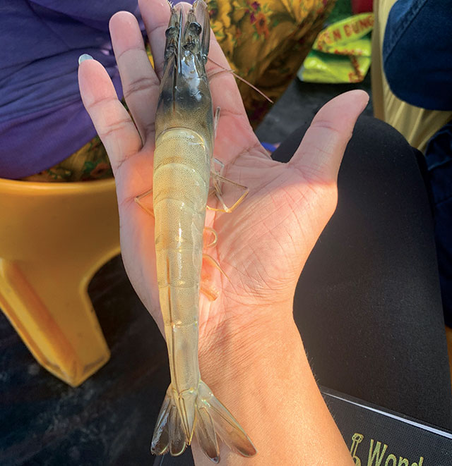 Tiếp tục dẫn chúng tôi đi tham quan các ao còn lại, trang trại gồm 4 ao nuôi với tổng diện tích 5.600 m2, kéo nhá kiểm tra tôm, cô Mến tự hào cho biết thêm, hiện tại khu nuôi vẫn còn 2 ao có tôm, trong đó một ao vừa thả 15 ngày tôm rất khỏe mạnh, ao còn lại 110 ngày tuổi tôm đạt kích cỡ 32 con/kg, ao nuôi này hiện đang được cô cho thúc tôm bằng thức ăn chuyên dụng GOAL FAST để về size lớn thu hoạch.