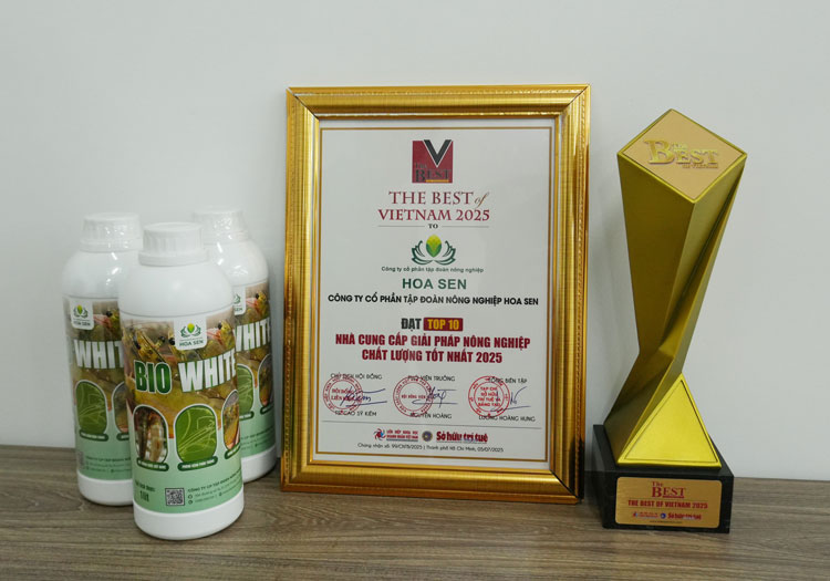 Một minh chứng khác thể hiện tầm vóc của Nông nghiệp Hoa Sen là mới đây, Tập đoàn được bình chọn nằm trong Top 10 Nhà cung cấp Giải pháp Nông nghiệp chất lượng tốt nhất 2025. Danh hiệu này đã khẳng định rõ chất lượng vượt trội của sản phẩm, giúp bà con an tâm đồng hành cùng Tập đoàn Nông nghiệp Hoa Sen trong mỗi vụ nuôi.