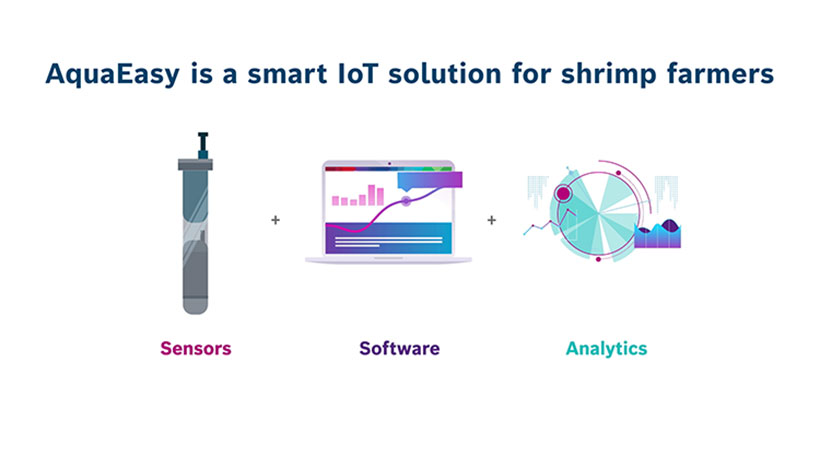 AquaEasy là một giải pháp IoT cho người nuôi tôm, bao gồm ba bộ phận chính: cảm biến thông minh, phần mềm di động và khả năng phân tích dữ liệu tích hợp AI.