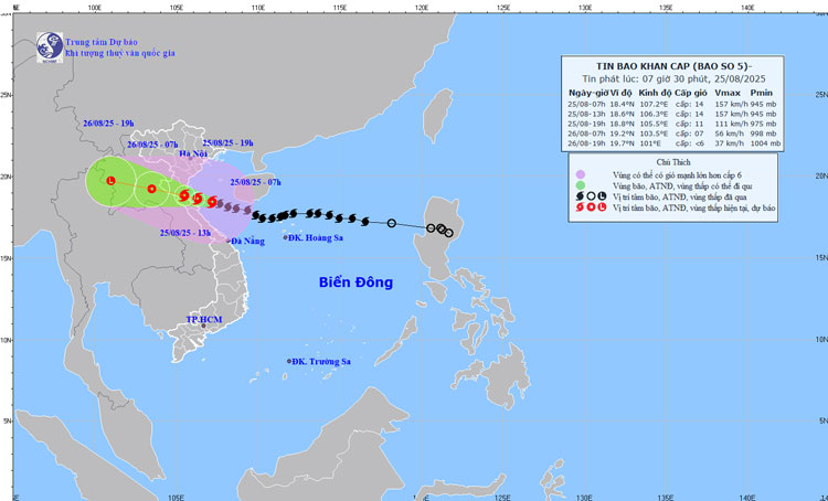 Theo Trung tâm Dự báo Khí tượng Thủy văn Quốc gia, hồi 4 giờ ngày 25/8, vị trí tâm bão số 5 ở khoảng 18,3 độ vĩ Bắc; 107,7 độ kinh Đông, cách Nghệ An khoảng 220 km, Hà Tĩnh 200 km về phía đông đông nam, cách bắc Quảng Trị khoảng 180 km về phía đông đông bắc. Sức gió mạnh nhất vùng gần tâm bão đạt cấp 14 (150 – 166 km/giờ), giật cấp 17. Bão di chuyển theo hướng tây tây bắc với tốc độ khoảng 20 km/giờ.