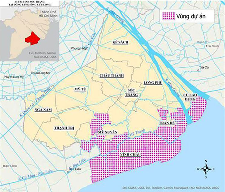 Vùng dự án rộng 542 ha ven biển với cửa sông Hậu (Bản đồ sử dụng khi nghiên cứu dự án còn tỉnh Sóc Trăng cũ, nay đã sáp nhập toàn bộ vào thành phố Cần Thơ)