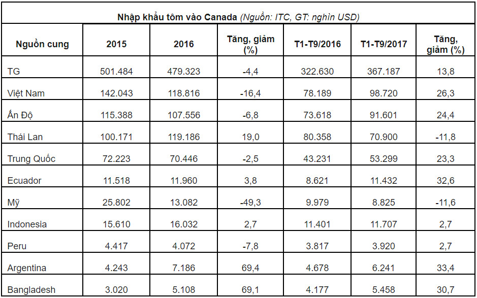 Chín tháng đầu năm 2017, NK tôm vào Canada đạt 367,2 triệu USD; tăng 13,8% so với cùng kỳ năm 2016. Tốp 4 nước cung cấp tôm lớn nhất cho Hàn Quốc gồm Việt Nam, Ấn Độ, Thái Lan và Trung Quốc. Việt Nam là nguồn cung tôm lớn nhất cho Canada, chiếm 26,9% tổng giá trị NK của thị trường trong năm 2016. Ấn Độ đứng ở vị trí thứ hai, chiếm 24,9%. Tiếp đó, Thái Lan, Trung Quốc lần lượt chiếm 19,3% và 14,5%. Từ 2007-2012, Việt Nam ổn định ở vị trí thứ 3 về cung cấp tôm cho Canada sau Thái Lan và Trung Quốc. Năm 2013, Việt Nam vươn lên vị trí thứ 2 chiếm tỷ trọng 21,3%. Từ năm 2014 đến nay, Việt Nam vượt qua Thái Lan trở thành nhà cung cấp tôm lớn nhất cho Canada.
