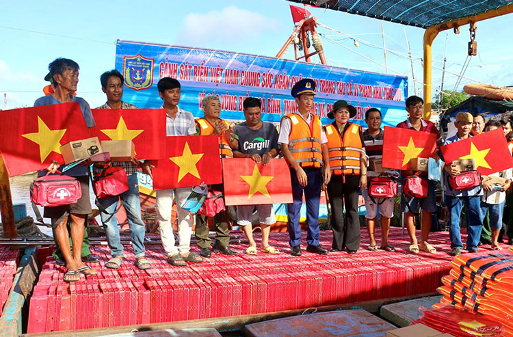 Bộ Tư lệnh vùng Cảnh sát biển 3 trao tặng cờ Tổ quốc, áo phao, đèn pin, túi thuốc y tế cho 10 ngư dân tại Cảng cá Định an, huyện Trà Cú
