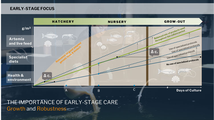 Quản lý giai đoạn đầu giữ vai trò quyết định trong việc hình thành những đàn vật nuôi khỏe mạnh và có sức đề kháng cao. Ở giai đoạn trại giống và ương vèo, ấu trùng và con giống ở trạng thái dễ bị tổn thương nhất: hệ miễn dịch chưa hoàn thiện, khả năng tiêu hóa còn yếu, dễ bị tác động bởi các biến động môi trường hoặc mầm bệnh.