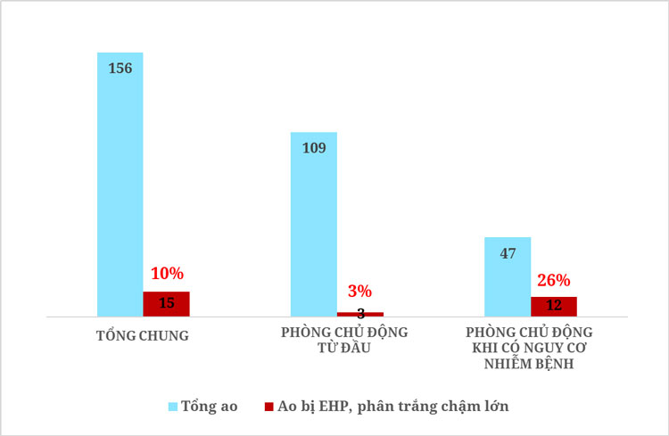 Kết quả khảo sát cho thấy hiệu quả vượt trội của phác đồ kết hợp “Bộ đôi” ESOMAX và STOP EHPi cho 2 tình huống Phòng chủ động từ đầu sau khi thả giống và phòng chủ động khi thấy nguy cơ nhiễm đều cho kết quả tích cực. Tuy nhiên với tình huống áp dụng phác đồ “Bộ đôi” phòng chủ động từ đầu sau thả giống thì tốt nhất với kết quả là 80% ao nuôi vượt qua mốc 60 ngày nuôi (giai đoạn nhạy cảm bệnh nhất của vụ nuôi). Đồng thời, 97% ao nuôi không bị nhiễm EHP và hội chứng phân trắng gây chậm lớn.