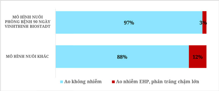 Đặc biệt kết quả phân tích cho thấy khi ao nuôi có áp dụng “Bộ đôi” kết hợp với mô hình nuôi được đầu tư & quản lý tốt thì tỷ lệ nhiễm bệnh EHP và phân trắng chậm lớn thấp. Các ao nuôi áp dụng mô hình phòng bệnh 90 ngày Vinhthinh Biostadt có sử dụng “Bộ Đôi” thì tỷ lệ nhiễm EHP, phân trắng gây chậm lớn thấp nhất (chỉ 3%).