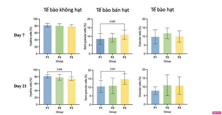 Ba loại bạch cầu được xác định gồm: tế bào hyaline (HC), bán hạt (SGC) và hạt lớn (GC). Trong đó, số lượng tế bào SGC ở nhóm F3 cao nhất, khác biệt có ý nghĩa thống kê so với F1 vào cả ngày 7 (P=0,038) và ngày 21 (P=0,007). Ngược lại, số lượng HC ở F3 lại thấp hơn đáng kể so với F1 vào ngày 21 (P=0,006) (Hình 1).