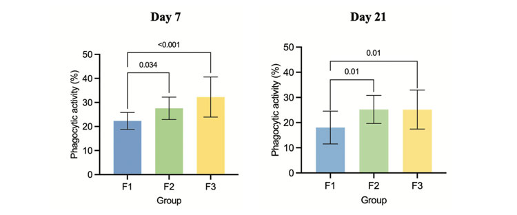 Tỷ lệ thực bào trung bình của các nhóm dao động 22,34 – 32,26% vào ngày 7 và 18,05 – 25,21% vào ngày 21. Nhóm F3 và F2 đều có hoạt tính thực bào cao hơn đáng kể so với F1 ở cả hai thời điểm (P<0,05) (Hình 2).