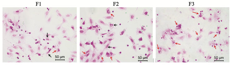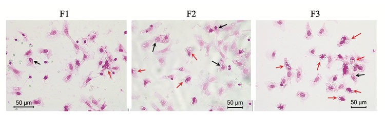 Hình ảnh minh họa hoạt tính thực bào của bạch cầu ở các nhóm khẩu phần F1–F3 được trình bày trong hình 3 (ngày 7) và hình 4 (ngày 21).