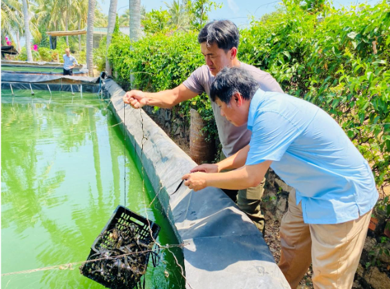 Kiểm tra cá chình tại mô hình triển khai tại xã Mỹ Thắng