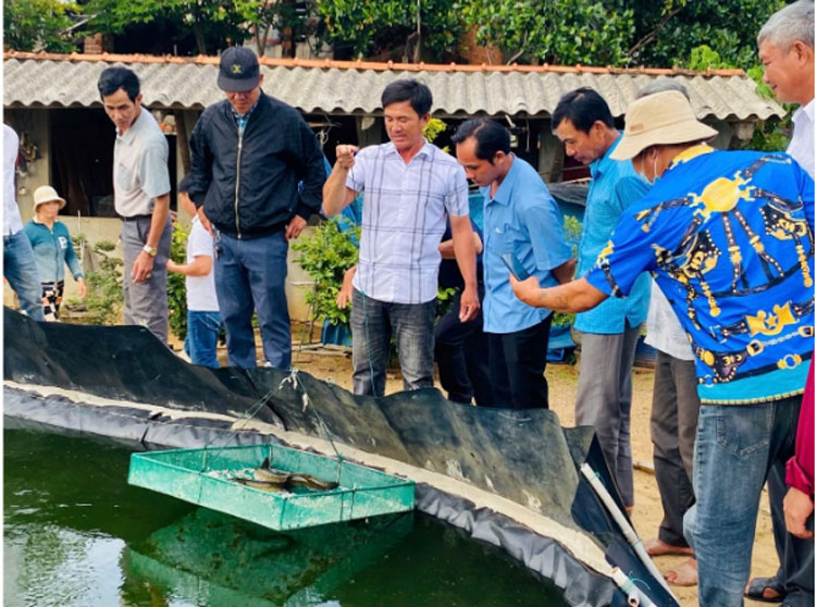 Bên cạnh đó, lớp tập huấn còn tổ chức cho bà con tham quan thực tế mô hình nuôi cá chình thương phẩm trong bể xi măng tại thôn Châu Trúc (xã Phù Mỹ Bắc) và thôn 7 Bắc (xã Phù Mỹ Đông). Tại đây, các hộ nông dân được tận mắt quan sát hệ thống bể nuôi, cách bố trí ao lắng, ao xử lý nước, quy trình cho ăn, quản lý môi trường nước,…. Qua đó, người dân có cơ hội trao đổi, học hỏi trực tiếp kinh nghiệm thực tế từ các hộ nuôi đi trước, từ đó rút ra bài học để áp dụng vào mô hình của gia đình mình.