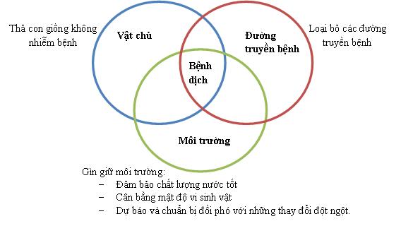 Theo đồ thị, ngoài nhân tố “Vật chủ” (con giống sạch bệnh) còn các nhân tố “Môi trường” và “Đường truyền bệnh” là các yếu tố con người có thể khống chế và tác động vào trong quá trình nuôi để đạt được vụ nuôi thành công. Đối với nuôi trồng thủy sản, môi trường sống của vật nuôi là môi trường nước, do đó mọi hoạt động sống cũng như đường lây truyền bệnh đa số đều được thông qua đó. Việc gìn giữ môi trường tốt sẽ giúp loại bỏ các đường truyền bệnh từ bên ngoài vào nước; đảm bảo cho đối tượng nuôi sinh trưởng và phát triển ổn định.