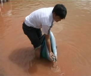 Mùi thuốc sâu bốc lên nồng nặc, gây khó thở giữa tiết trời oi nồng. Vài con tôm vùng vẫy trên mặt nước như bị điện giật khi nước sông chuyển từ màu trong xanh sang màu trắng sữa đục ngầu.