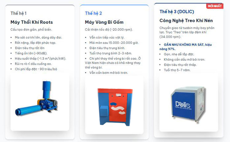 Trong suốt 3 năm vận hành mô phỏng ở trên, máy Roots cần thay dây curoa và nhớt hộp số ít nhất 6 lần. Máy Bi gốm cần thay thế vòng bi (bearing) tốn kém ít nhất 1 lần. Với DOLIC, chi phí bảo trì gần như bằng 0 (chỉ cần vệ sinh/thay tấm lọc gió).