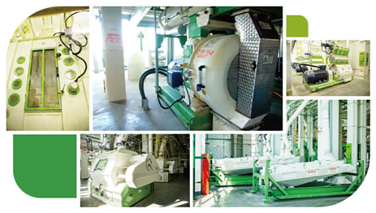 Đầu tiên, ngũ cốc thô được vận chuyển bằng xe lửa và ô tô đến kho silo. Những người điều hành sẽ bốc dỡ vào kho theo đúng chất lượng, chủng loại, lô nguyên liệu. Bột ngũ cốc được vận chuyển thẳng đến thùng vận hành bằng đường sắt. Nhà máy cung cấp nguyên liệu cho các giai đoạn sản xuất để sản xuất ra thức ăn chăn nuôi cân bằng chế biến sẵn.