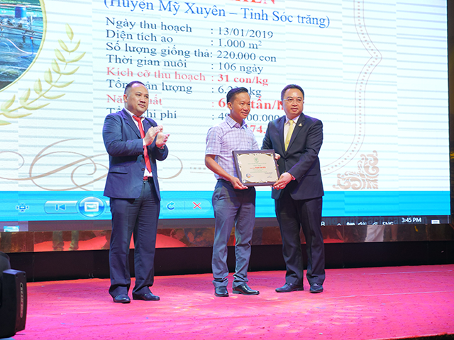 Cũng nhân dịp này, C.P. Việt Nam đã vinh danh cho khách hàng thực hiện xuất sắc mô hình CPF – Combine với các hạng mục thành tích khác nhau, như: năng suất cao nhất, kích cỡ lớn nhất, FCR thấp nhất, cùng 10 nhân viên C.P. Việt Nam xuất sắc trong việc đồng hành hỗ trợ khách hàng thực hiện thành công mô hình CPF – Combine. Hội nghị kết thúc bằng đêm Gala diner đầm ấm và thân thiết vào tối cùng ngày, với niềm tin vào sự thành công lớn hơn trong những vụ tôm tiếp theo với mô hình CPF – Combine của C.P. Việt Nam.