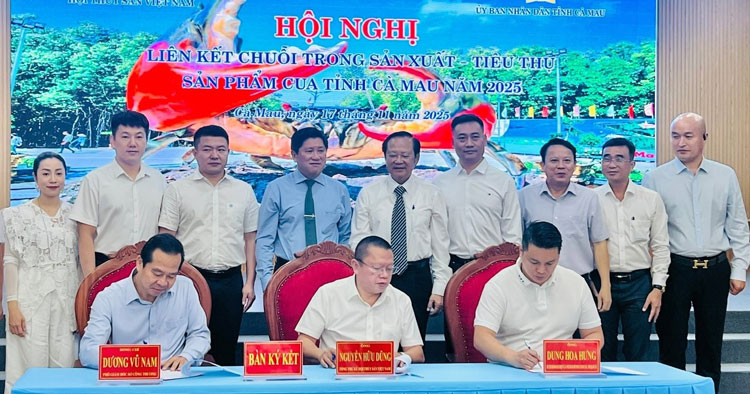 Đại diện Hội Thủy sản Việt Nam, Sở Công Thương tỉnh Cà Mau và Hiệp hội Doanh nghiệp vừa và nhỏ Trung Quốc ký kết biên bản ghi nhớ hợp tác phát triển sản phẩm Cua Cà Mau