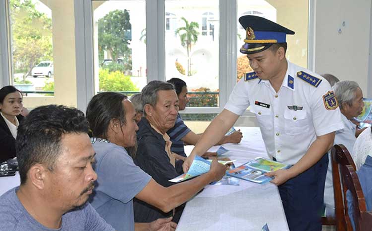 Cán bộ Vùng Cảnh sát biển 2 tuyên truyền, phát tờ rơi cho ngư dân (quận Ngũ Hành Sơn) về việc chống khai thác hải sản bất hợp pháp, không báo cáo, không theo quy định (IUU). Ảnh: P.V