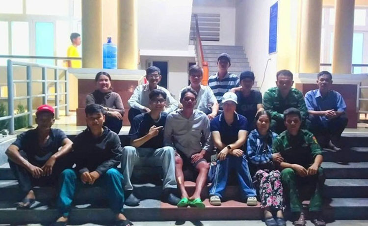 Ngư dân Trần Ngọc Thạch (ngồi giữa, hàng đầu) được cứu sống sau hơn 24 giờ lênh đênh trên biển. Ảnh: PV