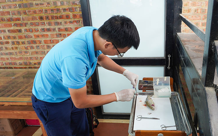 Ngay lập tức, cán bộ phòng xét nghiệm đã tiếp nhận và xử lý mẫu. Mỗi hộ nuôi có mẫu đều được cán bộ phòng xét nghiệm ghi nhận thông tin, quy mô, giống cá và tình hình cá bệnh tại ao nuôi. Sau đó, cán bộ phòng xét nghiệm sẽ quan sát, kiểm tra mẫu bệnh từ bên ngoài: Da, vây, đuôi, mang cá, lấy mẫu kiểm tra ký sinh trùng. Tiếp đó, cán bộ Mobil Lab sẽ mổ khám mẫu bệnh để kiểm tra gan, thận, ruột cá. Sau quá trình kiểm tra, xét nghiệm, cán bộ đã đưa ra một số kết luận về bệnh cũng như phác đồ điều trị cho các hộ nuôi.