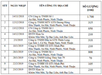 Ngày 26/2/2019, Công ty THNN Moana Ninh Thuận có văn bản số 0226/MNT-2019 gửi Tổng cục Thủy sản và Vụ Nuôi trồng thủy sản về việc thông báo tên các công ty, trại giống trong nước có mua tôm bố mẹ của Công ty từ ngày 14/11/2018 đến 23/2/2019. Cụ thể như sau: