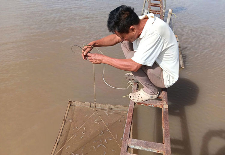 Người nuôi kiểm tra đầm tôm. Ảnh: Cẩm Trúc