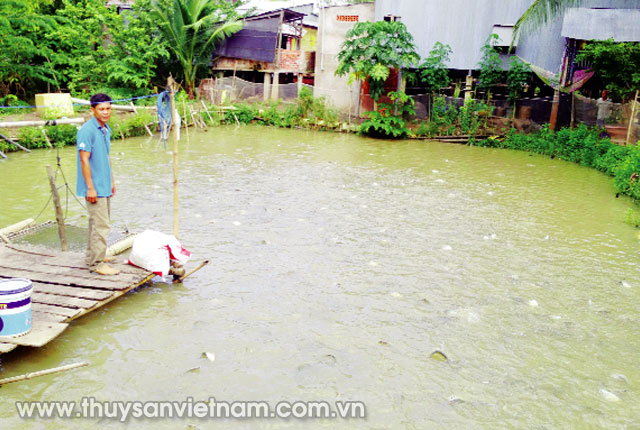 Còn ông Nguyễn Văn Thành ở xã An Long đã tận dụng cái ao nuôi cá tra cũ cạnh nhà để thả nuôi cá thát lát cườm theo mô hình VietGAP. Sau khi tiến hành cải tạo 300 m2 mặt nước ao cạnh nhà, lên bờ bao, vét đáy ao và vệ sinh sạch bằng vôi bột rồi phơi đáy ao khoảng 1 tuần, ông Thành bơm nước vào ao, tìm diệt các loại cá lóc, trê, ếch, rắn… rồi để khoảng 3 ngày cho nước trong ao có màu xanh của rong – tảo, vì đây là môi trường thích hợp để nuôi thủy sản. Sau đó, ông Thành thả 23.000 cá thát lát cườm giống vào ao ương nuôi. Ông Thành cho biết, lúc đầu, ông ương cá thát lát cườm giống trong mùng lưới cước được đặt trong ao. Từ 15 – 20 ngày đầu, ông cho cá ăn bằng thức ăn viên công nghiệp có độ đạm cao. Sau gần 1 tháng ương và chăm sóc, cá thát lát cườm giống phát triển, ông tháo mùng lưới cước ra nuôi đại trà trong ao và tiếp tục sử dụng thức ăn viên công nghiệp có nhiều độ đạm cùng với cá biển, cá tạp, cua ốc… xay nhuyễn trộn với bột keo và tăng lượng thức ăn lên theo quá trình tăng trưởng của cá.