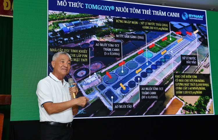 Tại hội thảo, tiến sĩ nói lên các thách thức trong mô hình nuôi tôm truyền thống như ô nhiễm nguồn nước, dịch bệnh lây lan và việc lạm dụng hóa chất. Những vấn đề này ảnh hưởng đến chất lượng sản phẩm, gây tổn hại nghiêm trọng đến môi trường tự nhiên. Cứ một tấn tôm tốn 0,5 ha đất, 6.000-9.000 m3 nước, phát thải 10,5 tấn CO2. Trong tổng lượng 10,5 tấn khí phát thải này, 50% bắt nguồn từ năng lượng từ hệ thống sục khí hoặc đảo dòng cung cấp oxy; 30% từ nguồn thức ăn; 16% từ các hoạt động sinh học trong ao nuôi.