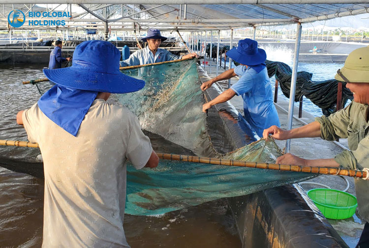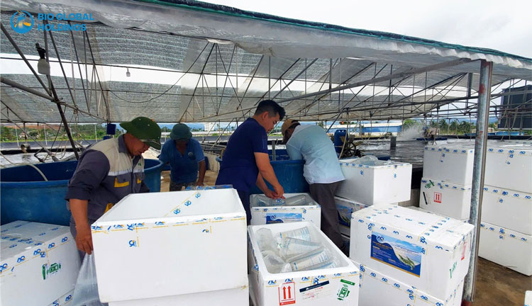 Chuyển tôm giống 18 ngày tuổi sang hệ thống ao lớn nuôi theo mô hình an toàn sinh học tại G-Farm Quảng Ninh. Ảnh: Bio Global Holdings