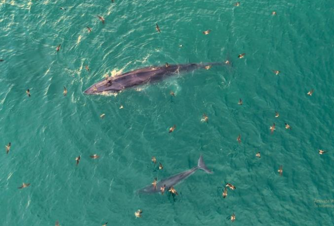 Cặp cá voi mẹ và con săn mồi gần bờ biển Vũng Bồi, Gia Lai. Ảnh: Hiếu Nghĩa (Báo Vnexpress)