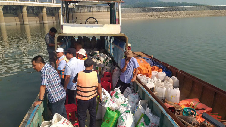Các đại biểu tham gia thả cá tái tạo nguồ lợi thủy sản tại hồ thủy điện Ia Ly Ảnh: Ái Trinh