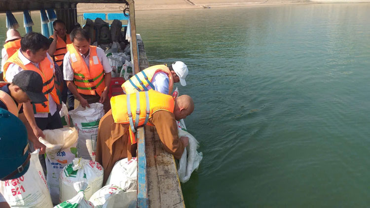 Hơn 70.000 con cá giống các loại được tập kết lên thuyền trước khi thả. Ảnh: Ái Trinh