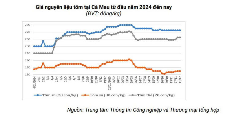 Theo số liệu cập nhật từ Bản tin Thị trường Nông Lâm Thủy sản (Bộ Công Thương) số ra ngày 22/12, ghi nhận tại các địa phương ven biển, giá nguyên liệu tôm trong những ngày giữa tháng 12/2025 không có biến động mạnh so với tháng trước, song xuất hiện xu hướng tăng nhẹ đối với một số cỡ tôm thẻ.