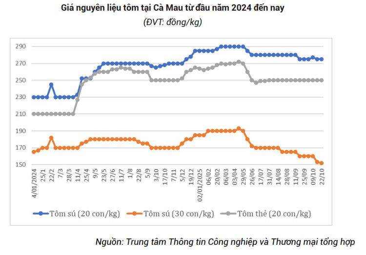 Tại Cà Mau, trung tâm nuôi tôm lớn nhất cả nước, giá tôm nguyên liệu có xu hướng ổn định nhưng phân hóa giữa các cỡ. Tôm sú cỡ 20 con/kg vẫn giữ mức 275.000 đồng/kg, trong khi cỡ 30 con/kg giảm 8.000 đồng, còn 152.000 đồng/kg. Tôm thẻ cỡ 20 con/kg vẫn duy trì ở 250.000 đồng/kg, phản ánh sự cân bằng cung – cầu trong giai đoạn giao mùa.
