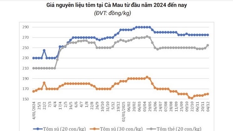 Ở vùng nuôi trọng điểm ĐBSCL như Cà Mau, giá tôm có xu hướng tăng nhẹ. Tôm sú cỡ 20 con/kg giữ ổn định ở mức 275.000 đồng/kg; tôm sú cỡ 30 con/kg tăng thêm 3.000 đồng/kg, đạt 160.000 đồng/kg. Đáng chú ý, tôm thẻ cỡ 20 con/kg tăng khá mạnh, thêm 7.000 đồng/kg, lên mức 255.000 đồng/kg so với đầu tháng 11.