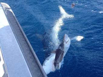 Tờ Daily Mail ngày 30/12 đã đăng tải một bức ảnh kỳ thú được chụp tại New Zealand tuần vừa rồi, trong ảnh một con cá mập lớn đã nhảy lên mặt nước, đớp con cá mập bé hơn đang bị kéo lên thuyền.